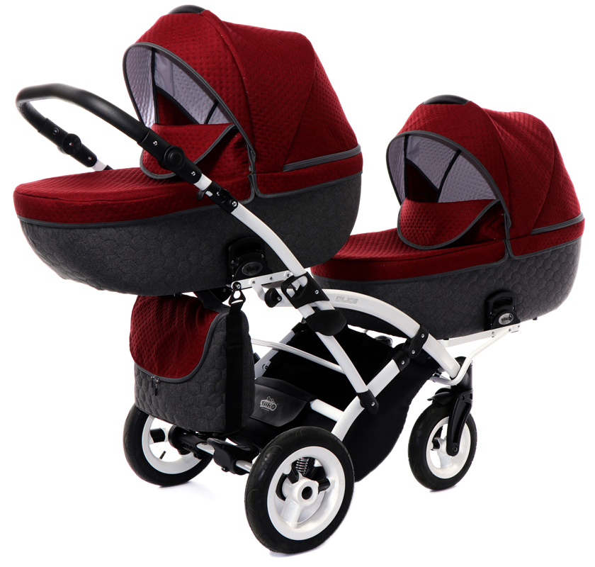 Комплектация коляски: 2 люльки, 2 прогулочных блока, 2 чехла на ножки, сумка и 2 дождевика
