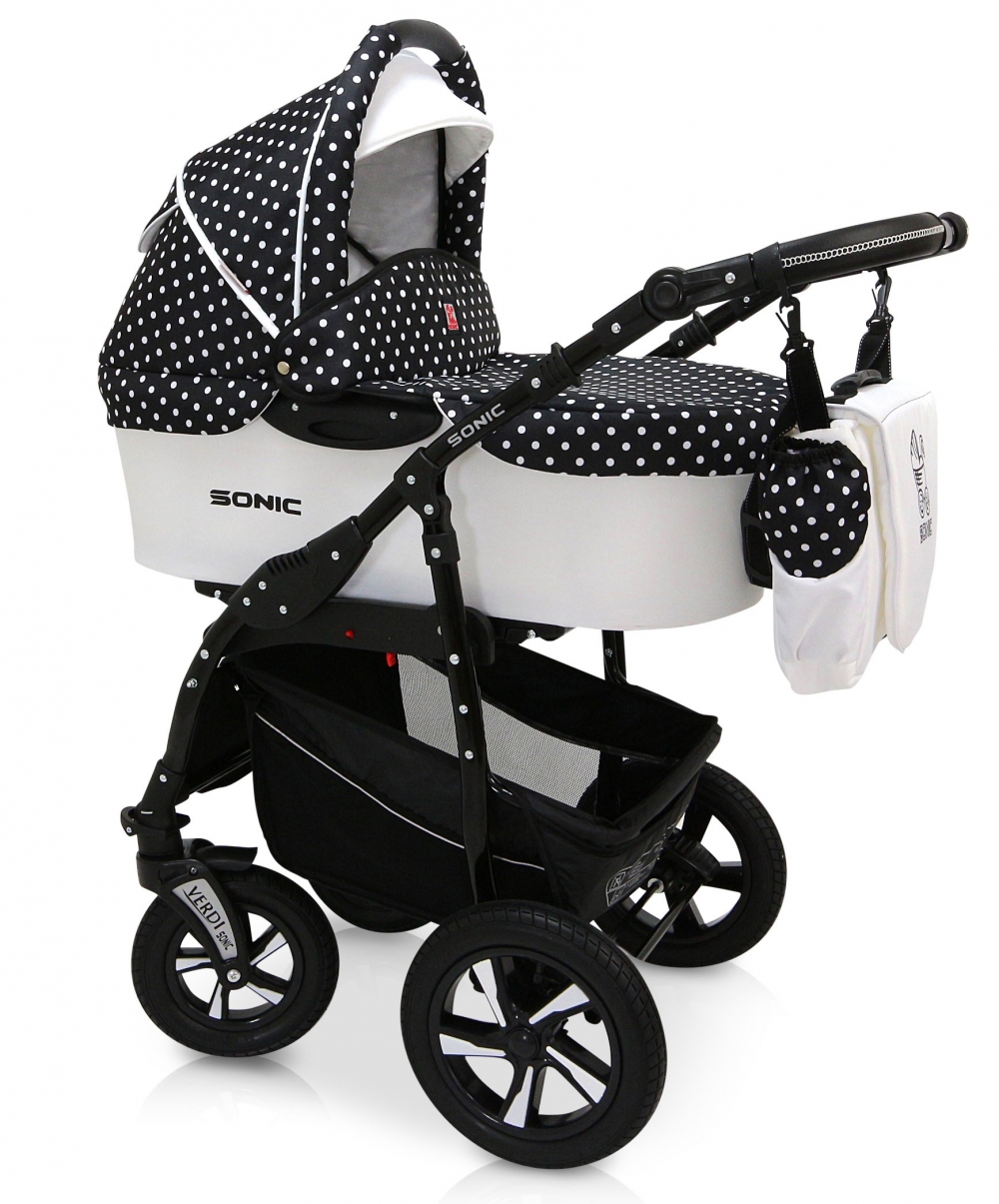 В комплекте с коляской Verdi Sonic идет уникальная сумка выполнена по неповторимому дизайну. В нижней части располагаются резиновые подкладки что бы сумку можно было поставить на твердое либо грязное покрытие и при этом она осталась чистой. Выполнена сумка из влагоотталкивающего материала, по бокам 2 кармана для бутылочек, что тоже очень удобно.